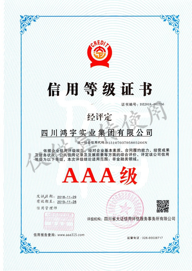 四川鸿宇实业集团有限公司始建于2002年4月,位于“中国科技城”——四川绵阳,注册资本1.2亿元。职工总数400余人,其中各类专业技术人员、中高级职称300余人。 鸿宇秉承“诚信、拓展、合作、奉献”企业精神,坚持“一业为主、多元发展、创新务实、内联外拓”的经营理念,建立了科学的管理体制和运行机制,并形成了具有鸿宇特色的管理模式和企业文化。